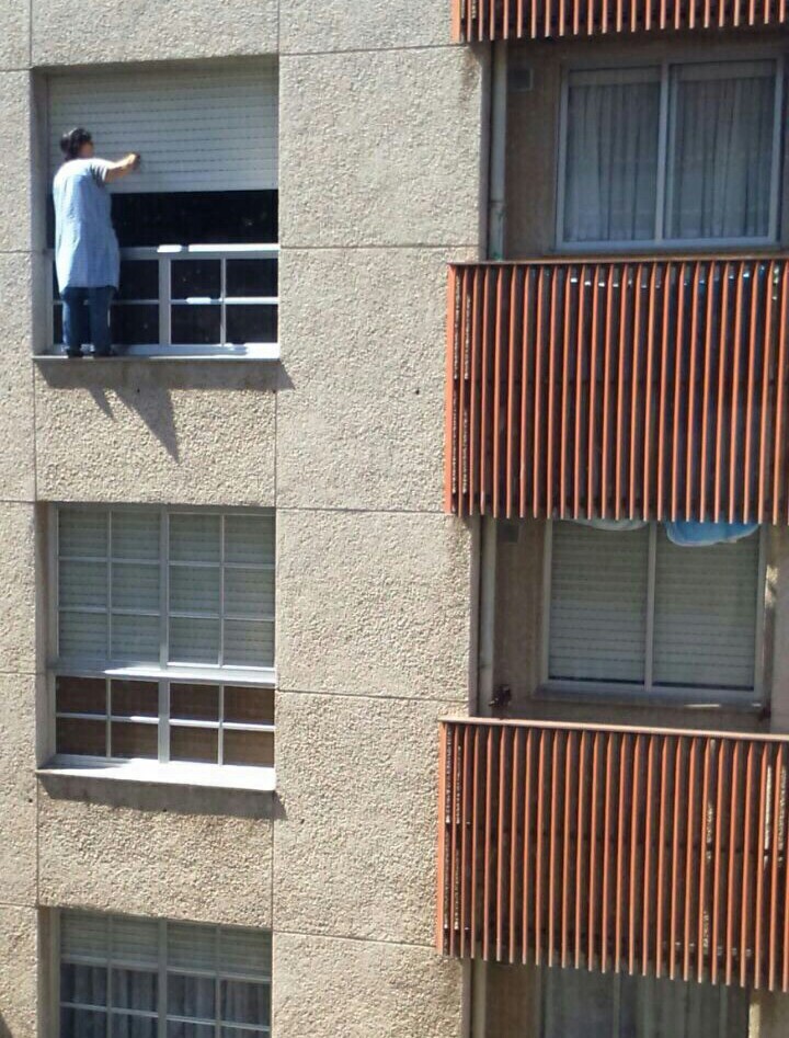 La mujer salió por un ventanal y puso sus pies en la repisa o alféizar para limpiar la persiana y los cristales y la estructura metálica de las ventanas de su tercer piso -insisto, el edifico tiene bajo, entresuelo y otras cuatro plantas-, pero lo hizo sin utilizar ningún tipo de medida de seguridad. La imagen tomada por un aficionado con su teléfono móvil empezó a circular por las redes sociales, convirtiéndose en viral, así como por diferentes tipos de mensajería. De ese modo, se extendió con gran rapidez de unas manos a otras. Esta vecina demostró, una vez más, que no le tiembla el pulso al acometer esta labor, demostrando que es una auténtica artista.
