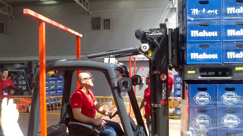 Otra de las pruebas que tiene que realizar consiste en coger en la punta de la horquilla una maqueta de carretilla con unas uñas de tres centímetros en las que debe enganchar cuatro tuercas y colocarlas unas encima de otras. Otra pasa por levantar una bandeja con botellas de plástico haciendo un recorrido, sin que le caigan, para luego colocarlas en una plataforma situada a cuatro metros de altura, algo similar a lo que sucede con una pelota de baloncesto que debe acabar metiéndola por un aro.
