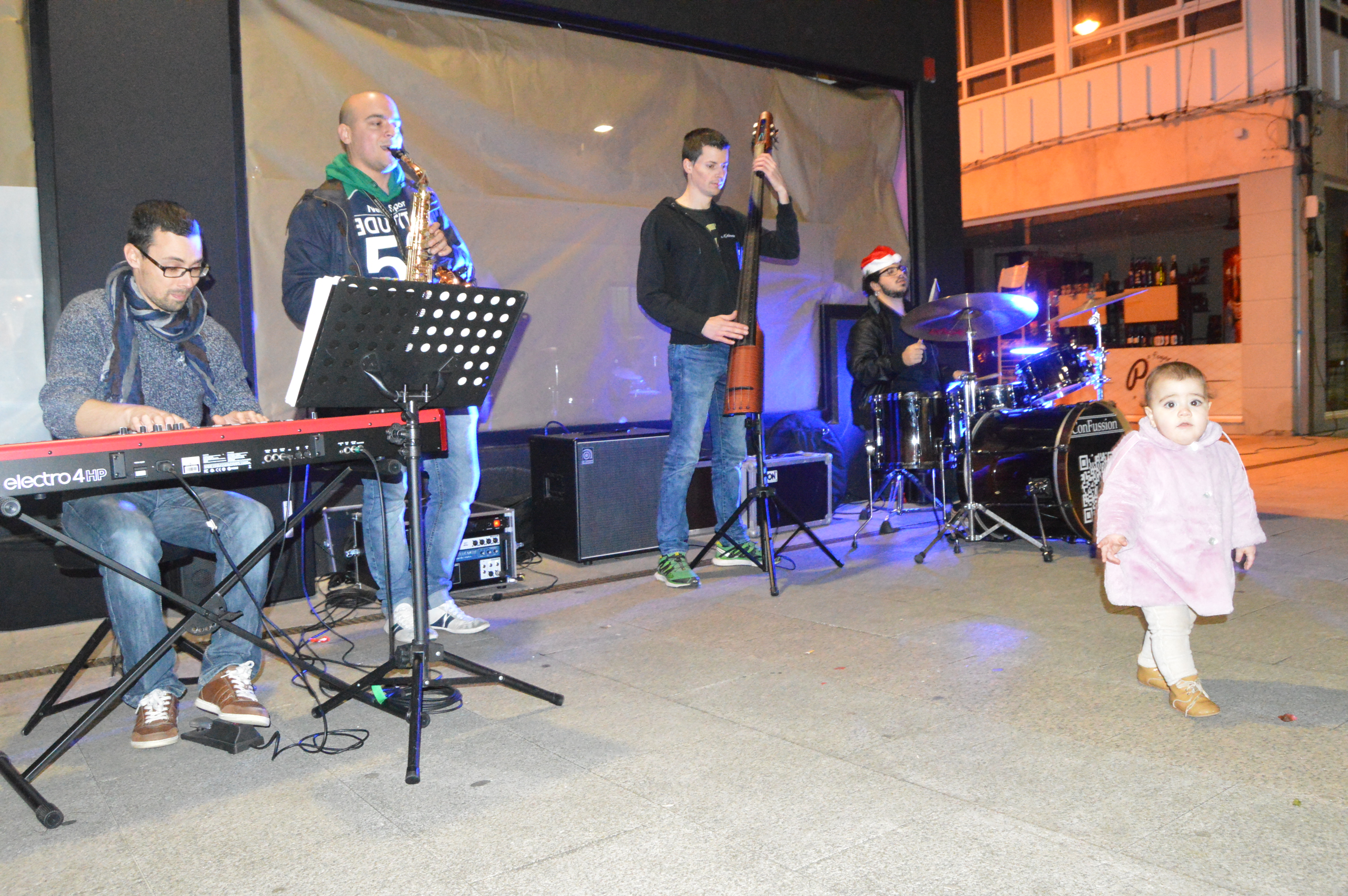 La Rúa Mariño de Rivera, a la altura de la Praza Uxío Novoneya, en pleno centro urbano de Ribeira, acogió a partir de las siete de la tarde de este sábado, día 2 de diciembre, un concierto de jazz a cargo del grupo ConFusión, dentro de las actividades del Nadal Cultural y que atrajo a un numeroso y variado público 1ue no se cansó de aplaudir después de cada pieza interpretada por estos grandes músicos, pero sobre todo al final de este fantástico recital.