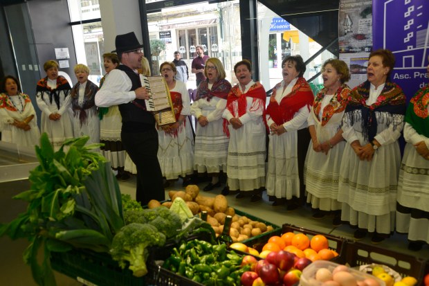 La actuación del coro de cantareiras Aires da Barbanza, perteneciente a la Asociación de Amas de Casa de Ribeira, sirvió ayer al mediodía para conmemorar el primer aniversario de la entrada en funcionamiento de la plaza de abastos en el edificio del nuevo mercado municipal de la capital barbanzana. Las voces de las intérpretes sonaron en la instalación ante la expectación de usuarios e curiosos que se encontraban en la planta baja del inmueble Entre los asistentes se encontraban la edil delegada del área ribeirense de Mercados, Esther Patiño, y el alcalde, Manuel Ruiz.