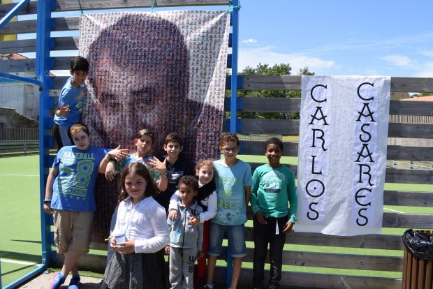 O colexio plurilingüe Frións, de Ribeira, celebrou onte unha Romaría das Letras Galegas que arrancou cunha simulación dun mercado, no que houbo postos de chacinería, pastelaría, froitaría, panadería, xoiaría, maios, marcapáxinas de Carlos Casares, decoración de vasos con motivos como o autor homenaxeado ou a bandeira galega, bingo, obradoiro de maquillaxe, todo elo atendido en quendas polos alumnos. Ademáis houbo unha taberna ao fronte da que estiveron os pais. De aí pasouse a cantar coplas dos maios, e logo chegaron as actuacións das pandereteiras, a representación da obra teatral “A mellor sopa do mundo” a cargo dos nenos de 2ºA de Educación Primaria, mentres que os rapaces de Infantil fixeron unha coreografía coa canción popular “A carrasquiña”. Tamén elaboraron cunha aplicación informática unha imaxe a gran tamaño de Carlos Casares coas fotografías dos arredor de 210 alumnos e 25 profesores, algunas delas tiveron que repetirse para completar o retrato.