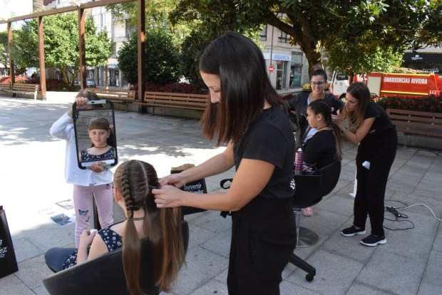 Medio centenar de mujeres se pasaron entre la mañana y las primeras horas de la tarde de este jueves, dúa 14 de septiembre, por la Praza do Concello de Ribeira para que el personal de peluquería Eva Méndez, dentro de la actividad “Peitéate na rúa de la Semana da Moda de la capital barbanzana, les cambiase el peinado. Las trenzas de boxeadora fueron las que tuvieron más éxito, pues hicieron 40, mientras que el resto fueron trenzas con moño y trenzas en el flequillo. En un principio se había anotado con cita previa un total de 28 personas, pero entremedias pudieron atender a las personas que reclamaron sus servicios al verlas trabajando en la vía pública.