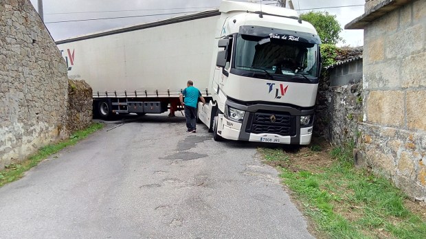 RIBEIRA – Un tráiler queda atrapado entre unas curvas de una pista que atraviesa por el lugar de Sirves, en la parroquia de Olveira
