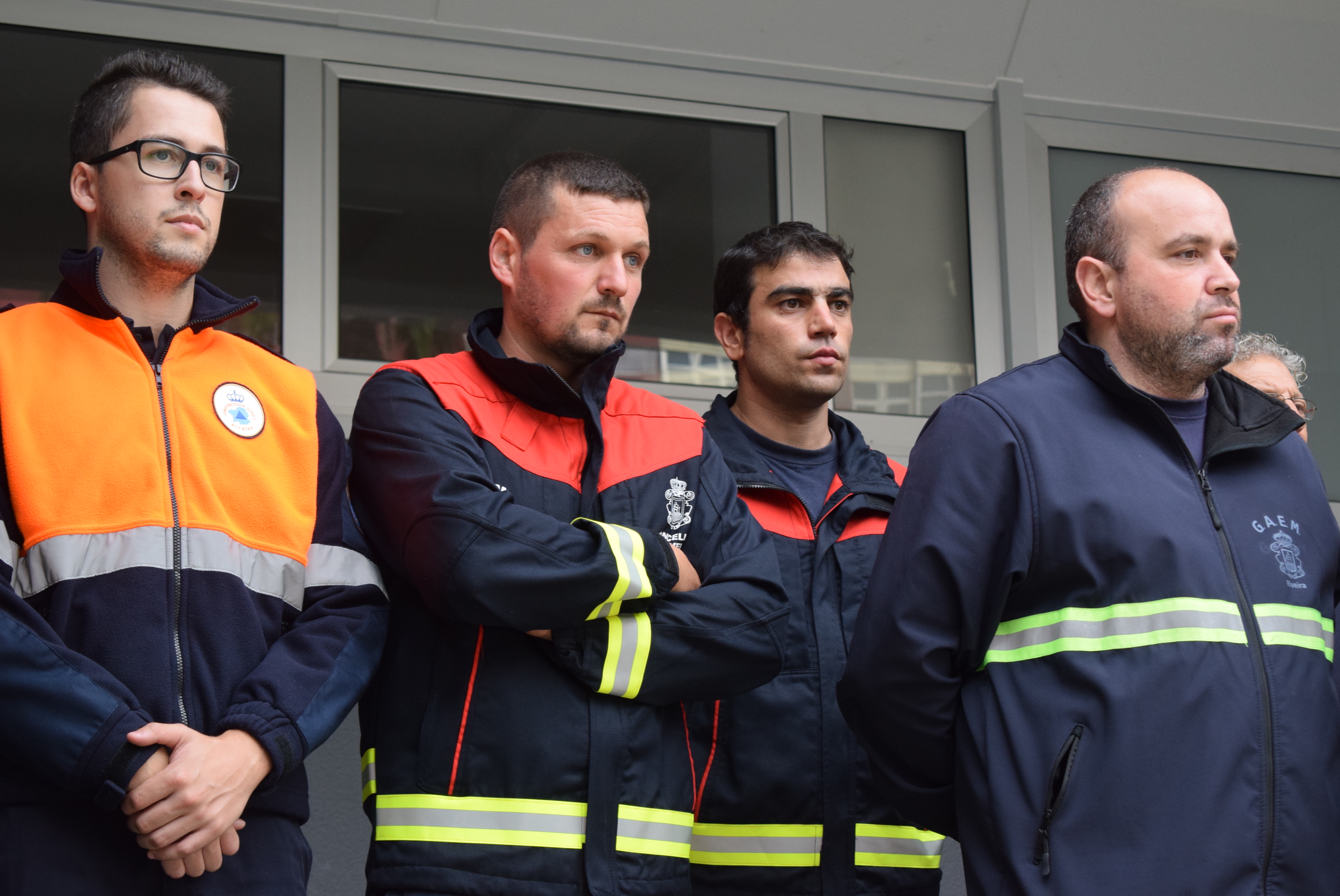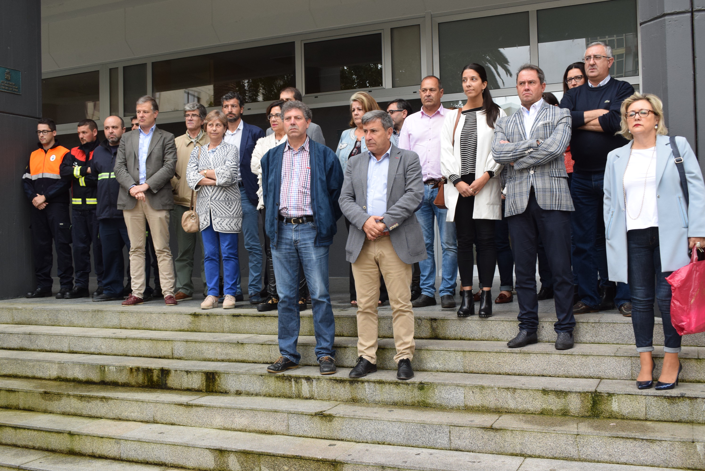 Los soportales de la casa consistorial de Ribeira acogieron este lunes, a las doce y media del mediodía, un acto en el que se guardó un minuto de silencio en homenaje y memoria de las víctimas e los incendios forestales que asolaron la geografía gallega durante el pasado fin de semana, entre los que no fue ajeno el municipio ribeirense, con un fuego en Salmón (Oleiros), otros tres en Chimpín y Chacín (Palmeira) y uno más en el entorno del aparcamiento de las dunas, en la parroquia de Olveira. En una de las fotografías aparecen cuatro de los efectivos del Grupo de Apoio e Emerxencias Municipal (GAEM) y voluntarios de la agrupación de Protección Civil que no descansaron durante la jornada dominical para poder hacer frente a las llamas.