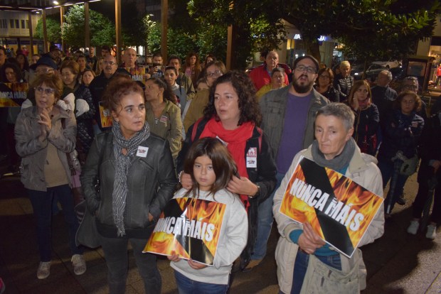 El lema “Lumes Nunca Máis” recorrió a última hora de la tarde de este lunes la Praza do Concello de Ribeira en una concentración a la que asistieron unas 200 personas, que expresaron su rechazo a los incendiarios, pero también a las políticas que sustentan las catástrofes forestales. Se dio lectura a un manifiesto en el que se reclamó “tiempo” para comenzar el debate, pero también se hizo hincapié en la necesidad de reconocer los “erros” y solventarlos . Errores como incidir en las plantaciones de eucalipto y poner “atrancos” a la repoblación con especies autóctonas; pero también otros más directamente relacionados con las escenas de terror que se vivieron el domingo. “Houbo unha evidente falta de organización ao deixar circular nalgunhas estradas», dijo el joven que hizo de portavoz. El colectivo demanda más ayudas para la limpieza de los montes y que se ponga fin a la “precariedade” en el servicio de extinción de incendios, rechazando el “despedimento” de los brigadistas de la empresa pública Servizos Agrarios Galegos, SA, (Seaga). Antes de la lectura del manifiesto, los asistentes guardaron un minuto de silencio en memoria de las cuatro personas fallecidas en los incendios registrados el pasado fin de semana. Como curiosidad, mientras se exclamaban consignas en contra de las políticas contraincendios de la Xunta, el portavoz cometió un lapsus al empezar a decir «Feijóo escoita, o ensino…», para seguidamente y entre risas pasar a decir «Feijóo escoita, Galicia está en loita».
