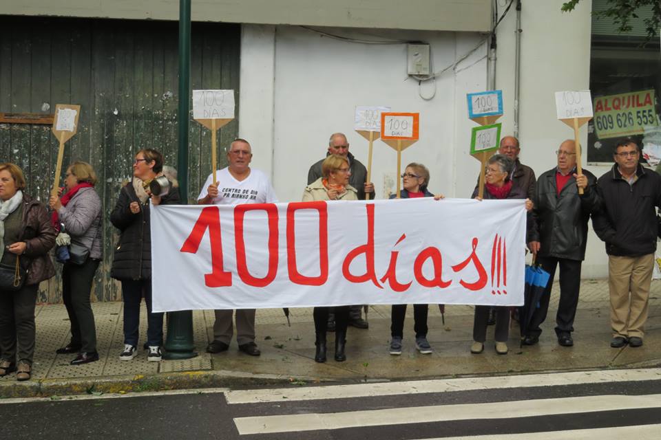 Cuando se cumplen 100 días del encierro en la casa consistorial de Rianxo por parte de la plataforma que solicita un centro de día en la localidad barbanzana, miembros de este colectivo que impulsa diferentes acciones de protesta para la puesta en marcha de ese tipo de servicio trasladaron este miércoles, día 18 de octubre, su reivindicación nuevamente a Santiago de Compostela, escenificando sus demandas concretamente en la Praza do Obradoiro y al Pazo do Hórreo, en donde les acompañaron alumnos del ciclo formativo de atención sociosanitaria del IES Félix Muriel. Del mismo modo, hicieron uso de cacerolas y de otro tipo de artilugios para hacerse oír y exhibieron pancartas con textos relativos a su demanda y también alguna en la que se recogía la referencia a los 100 días del referido encierro en los que no han conseguido su objetivo. Aunque las fuerzas empiezan a flaquear entre los mayores que se están movilizando, parece que no van a bajar los brazos para conseguir que desde la Xunta se atienda su petición, para la que cabe recordar que había un compromiso por parte de la Administración autonómica para poner en marcha esa infraestructuras o servicio.