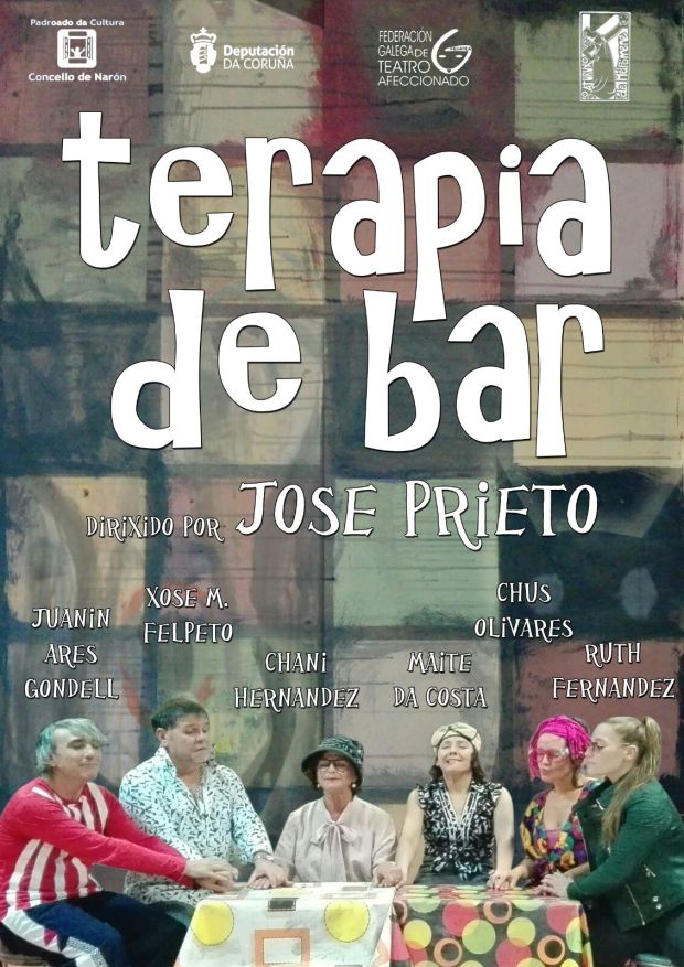 Se trata de una comedia de terror, vicios y manías de unos 65 minutos de duración recomendada para mayores de doce años, en la que se narra la historia del bar “Da costa” que o se encuentra en el litoral, sino que se encuentra perdido en medio del monte, lejos de cualquier sitio, donde rara vez para nadie y cuando lo hace no vuelve nunca más. Movidos por el aburrimiento y por su desequilibrio psíquico, la propietaria de ese negocio hostelero y sus dos únicos clientes habituales deciden convertirse en salvadores de la humanidad y elaboran un plan para eliminar del mundo los vicios que, según ellos, son los culpables de todos los males del ser humano. De ese modo, cada cliente que tenga la mala suerte de entrar en el bar comprobará en sus propias carnes las terribles terapias que les aplicarán los “salvadores” para liberarlos de sus vicios. Cada terapia elimina efectivamente cada vicio, aunque con pequeños daños colaterales: también puede eliminar al paciente. Según los responsables de la compañía teatral el local de “Terapia de bar” no es “La matanza de Texas” pero tampoco es “La casa de la paradera” para quien se atreva a visitarlo. El elenco de actores lo componen Juanín Ares Gondell, José Manuel Felpeto, Chani Hernández, Maite Dacosta, Chus Olivare y Ruth Fernández.