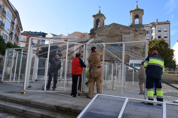 Además de que desde hace varias semanas ya se pueden ver en las estanterías de los supermercados los turrones, los polvorones, los mazapanes y otros productos navideños, un símbolo inequívoco de que cada vez queda menos para la celebración de la Navidad es la instalación del belén en la Porta do Sol de la capital barbanzana. Usuarios y monitores del taller de carpintería de la Unidad Asistencial de Drogodependencias (UAD) de Ribeira iniciaron este lunes en esa superficie el montaje de la estructura metálica y de cristal en cuyo interior se instalará el nacimiento. Aunque por el momento nada concreto se sabe de las fechas en que se descubrirá dicha estampa, tradicionalmente se hace coincidir con las fechas próximas al Día de la Constitución, aunque el hecho de que este año pretenda apoyar la campaña comercial navideña desde su arranque el primer día de diciembre podría hacer que se adelantase ese acontecimiento.