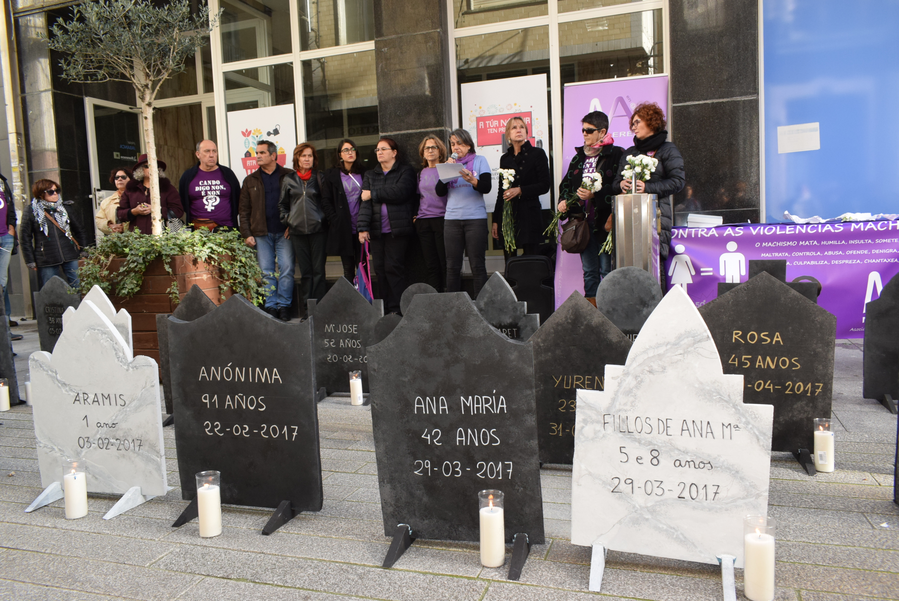 El tramo peatonal de la Rúa de Galicia, en Ribeira, acogió la actividad “Mulleres mortas, tumbas cheas”, promovido por Mulleres en Acción y la Comisión pola Recuperación da Memoria Histórica do Barbanza. Al inicio y final se llevó a cabo la lectura de un manifiesto ante de una recreación de lápidas de 45 mujeres asesinadas, y sus hijos, a manos de sus parejas, y en las que se depositaron flores.