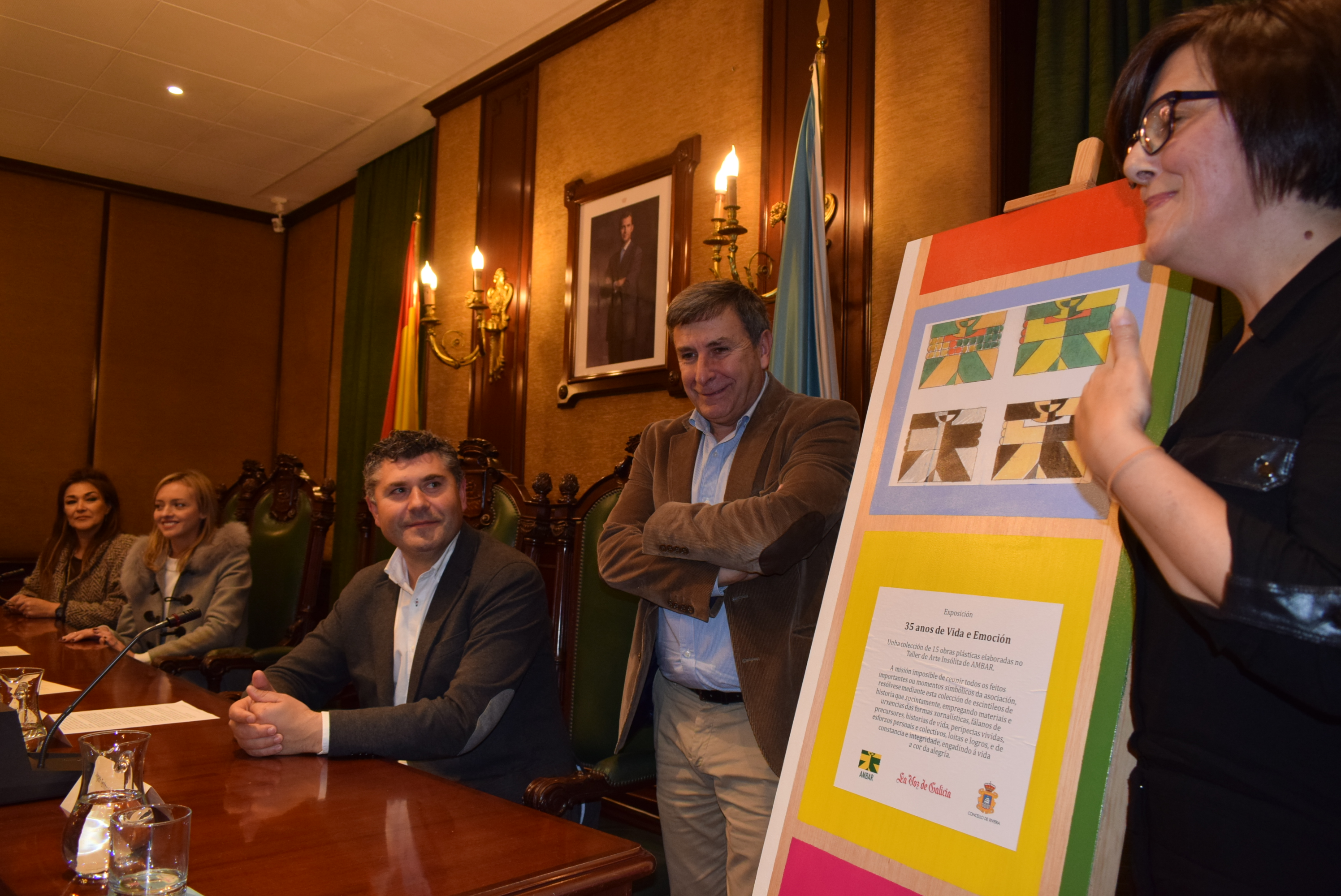 La asociación Ámbar inauguró a última hora de la tarde de este viernes en la casa consistorial de Ribeira, con un salón de plenos abarrotado como pocas veces se ha visto, la exposición con 15 obras elaboradas en su taller de arte -combinan texto, fotografía y pintura-, y con la que conmemora sus «35 años de vida e emoción», en los que se encontró con muchas barreras, pero que con esfuerzo ha logrado una mayor accesibilidad, pese a que todavía queda mucho camino por andar, según manifestó su presidenta, Milagros Rey. Por su parte, el alcalde ribeirense, Manuel Ruiz, que recordó como antes la gente los llamaba «minusválidos», después «discapacitados» y ahora «persoas con diversidade funcional», expresó su orgullo de que la «casa de todos» de cabida a esta exposición que recoge en una selección de imágenes parte de la historia de una entidad que se ha esforzado por lograr la eliminación de barreras arquitectónicas, y puso algunos ejemplos de edificios y espacios públicos en los que no hace mucho se actuó en ese sentido, como en el departamento de tesorería municipal -curiosamente ese departamento acogió el aperitivo que se sirvió tras la inauguración- o el conservatorio municipal. También intervino el delegado territorial, Ovidio Rodeiro, que incidió en la gran labor que ha desarrollado Ámbar en sus siete lustros de existencia y que la sitúa a la vanguardia de la inclusión social. Todos ello hicieron votos por que dentro de otros 35 años más se puedan volver a reunir en el mismo lugar para esa celebración.