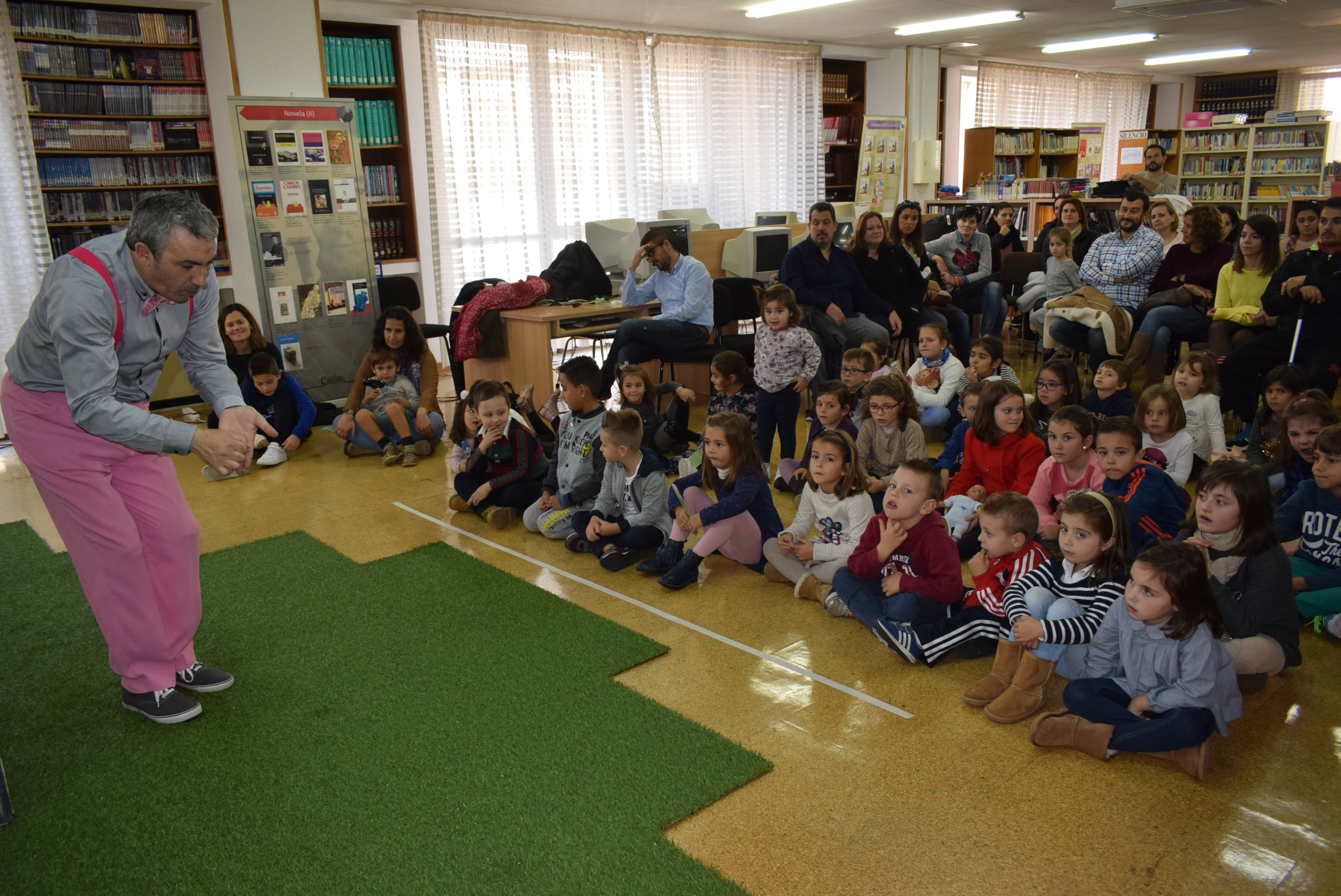 Una treintena de niños con edades entre 4 y 8 años asistieron a la sesión de cuentacuentos “Rosa Caramelo e outras historias”, que intepretó Artur Trillo en la biblioteca municipal de Ribeira. Este espectáculo teatral, que formó parte del ciclo Sábados de contos na Biblioteca Municipal que promueve el Servizo de Normalización Lingüística del Concello ribeirense, está creado a partir de cuentos de Adela Turín, ilustrados por Nella Bosnia y editados por Lalandraka, y se trata de una producción de Talía Teatro bajo la dirección de Paula Carballeira.