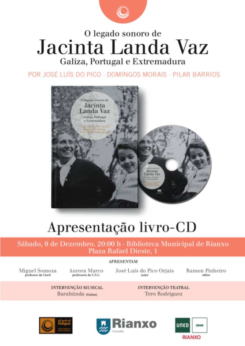 El libro-CD “O legado sonoro de Jacinta Landa Vaz. Galiza, Portugal e Estremadura”, escrito por José Luis do Pico, Domingos Morais y Pilar Barrios, será presentado el sábado (20.00 horas) en la biblioteca municipal de Rianxo. Además de la intervenciones de Miguel Somoza (profesor da UNED), Aurora Marco (profesora da USC), José Luís do Pico Orjais (autor) y Ramón Pinheiro (editor), se contará con la actuación musical de Barahunda y otra teatral de Tero Rodríguez.