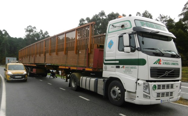 BOIRO – Un camión especial que transportaba un puente de madera para el paseo del río Coroño atravesó la localidad