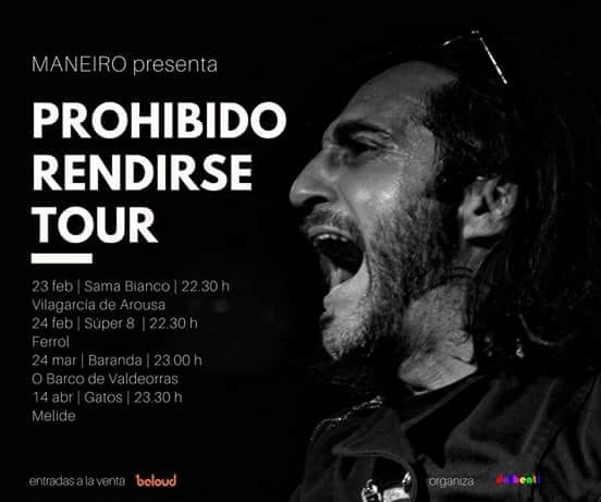 Javi Maneiro, voz de Heredeiros da Crus, que inició hace un año su carrera en solitario con la realización de una campaña de crowfunding para la edición de su álbum “Furtivos”, realizará en los próximos meses una gira de conciertos, “Prohibido Rendirse Tour”, para la que ya se conocen las primeras fechas. La primera cita será el 23 de febrero en Sama Blanco (Vilagarcía) y un día después en la sala Super 8 (Ferrol), y el 24 de marzo estará en la Sala Baranda (O Barco de Valdeorras) y el 14 de abril en el Pub Gatos (Melide). Las entradas ya se encuentran a la venta por 8 euros en la plataforma digital Beloud.